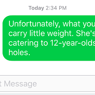 What I dictated into my phone: "Unfortunately, what you say will carry little weight. She's all about catering to 12 year-old imbeciles."